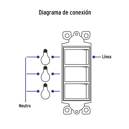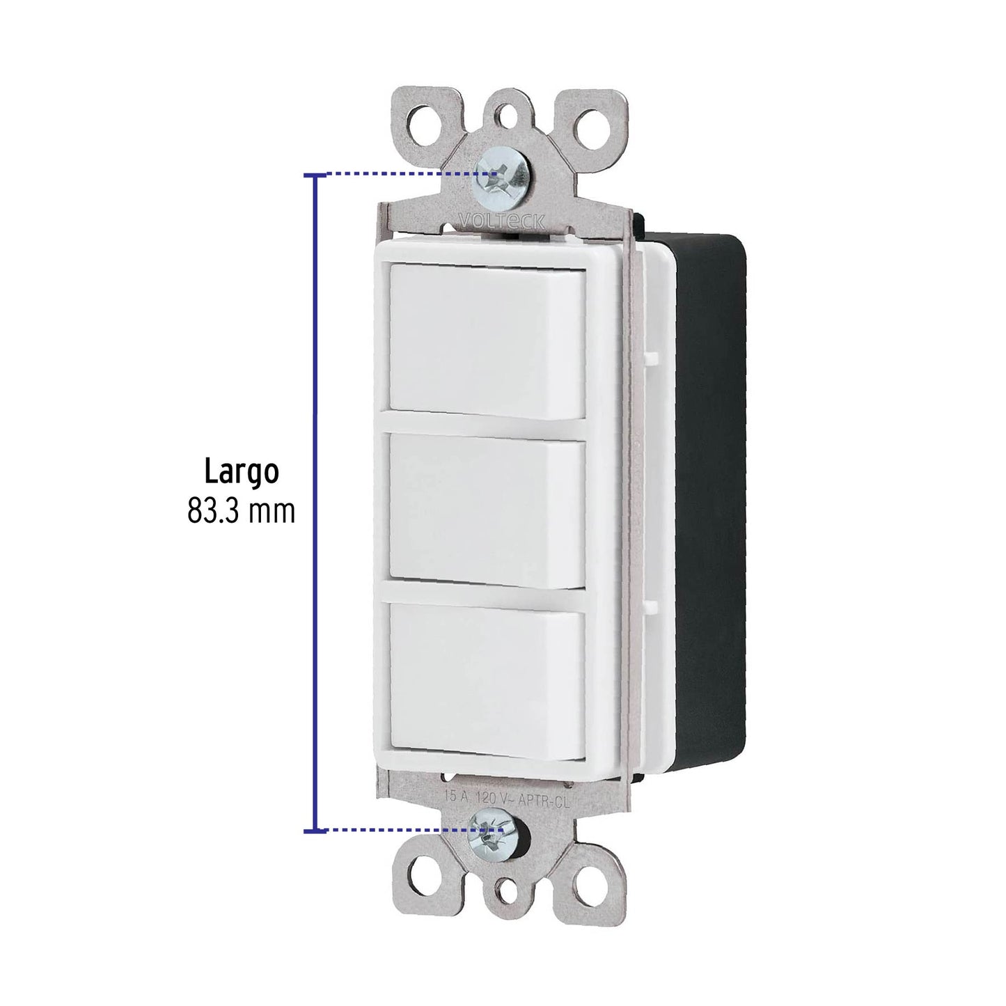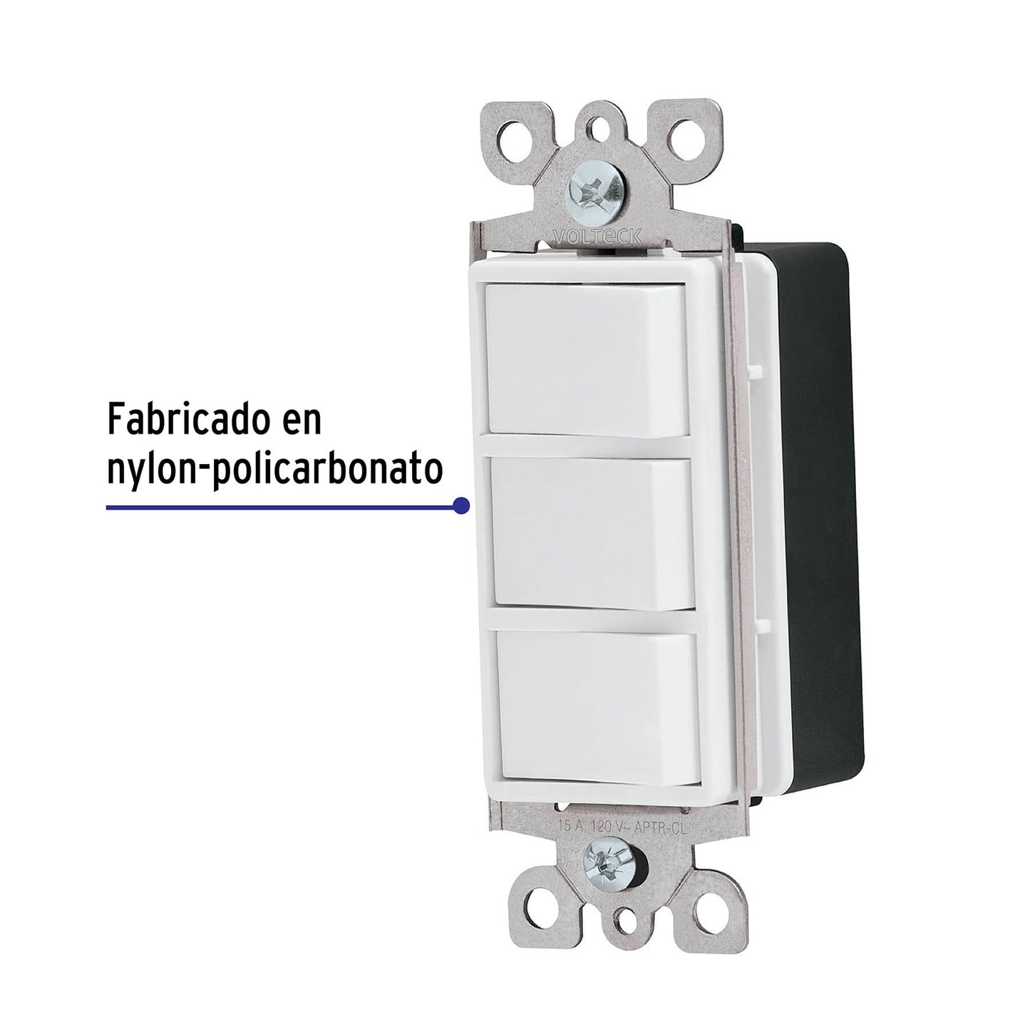 El Interruptor Triple Volteck APTR-CL, parte de la distinguida línea Classic, es una solución eléctrica altamente funcional diseñada para controlar hasta tres circuitos de iluminación de forma independiente desde un único punto. Este diseño optimiza el espacio en la pared y es ideal para estancias amplias, salones o comedores donde se requiere gestionar múltiples fuentes de luz, aportando tanto comodidad como eficiencia.