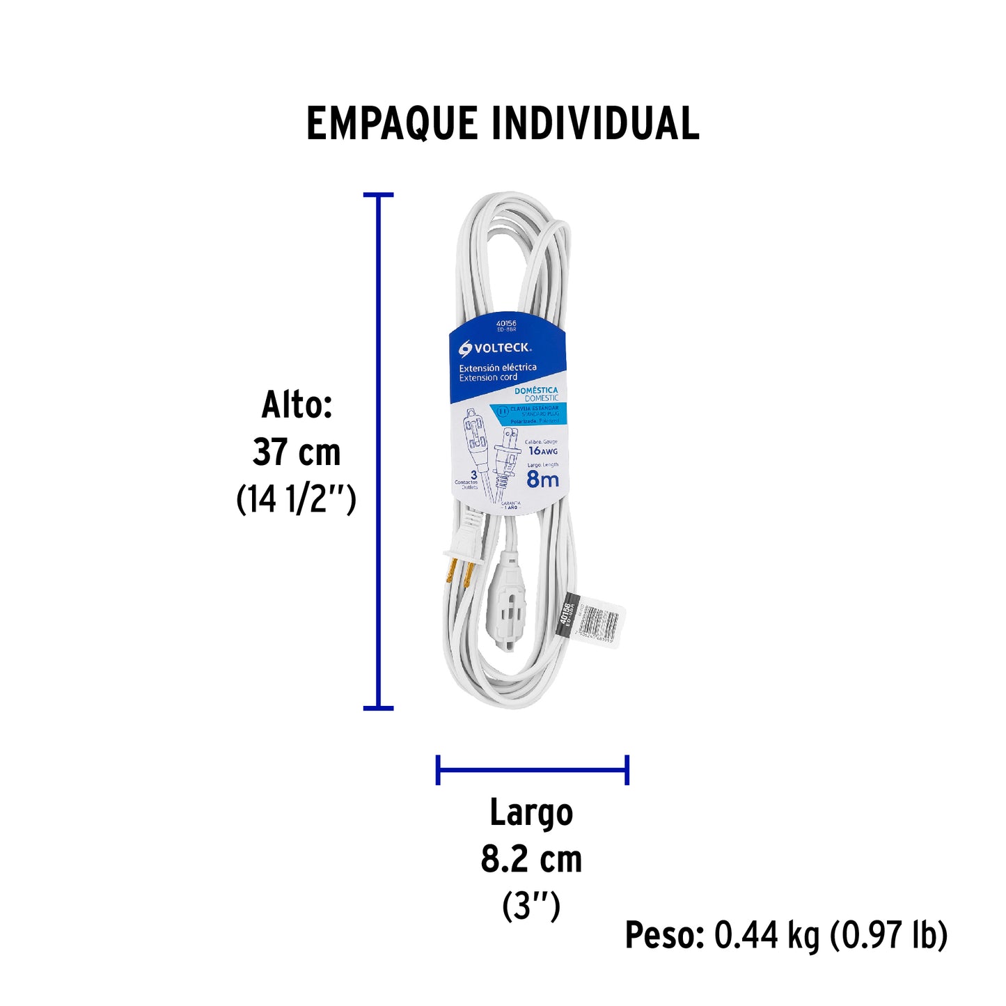 La Extensión Eléctrica Doméstica Volteck ED-8BR, con una longitud de 8 metros y clavija recta, en color blanco, es un accesorio eléctrico esencial para ampliar el alcance de tus aparatos en el hogar o la oficina. Su diseño compacto y discreto la hace ideal para uso diario, permitiendo conectar electrodomésticos, lámparas, cargadores y otros dispositivos a una toma de corriente más lejana, con un alcance considerable.