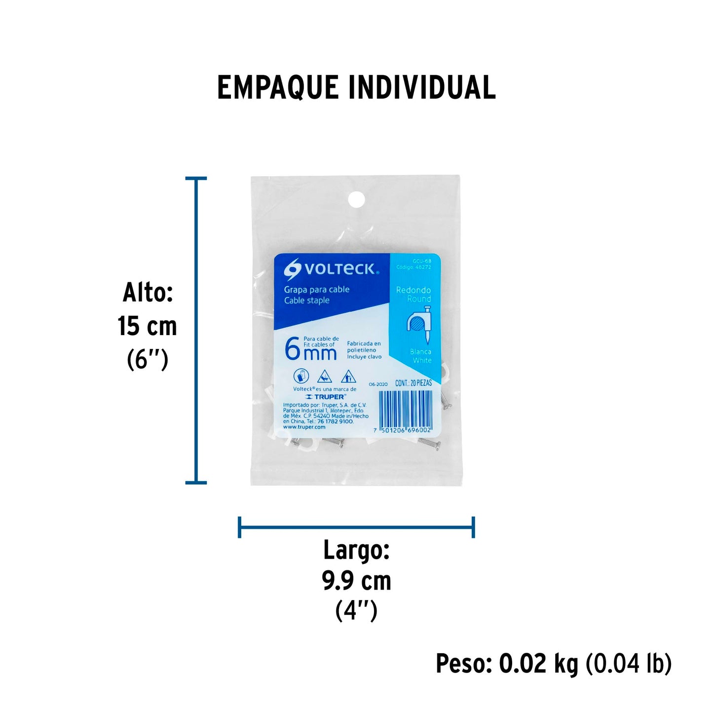 La Bolsa con 20 Grapas Volteck GCU-6B, con un diámetro de 6 mm y un elegante color blanco, es un accesorio de fijación esencial diseñado para la organización y el enrutamiento seguro de cables eléctricos redondos. Estas grapas, que incluyen un clavo de acero integrado, permiten sujetar firmemente el cable a paredes de madera o concreto, garantizando una instalación limpia y profesional que minimiza el riesgo de tropiezos o daños al cableado.