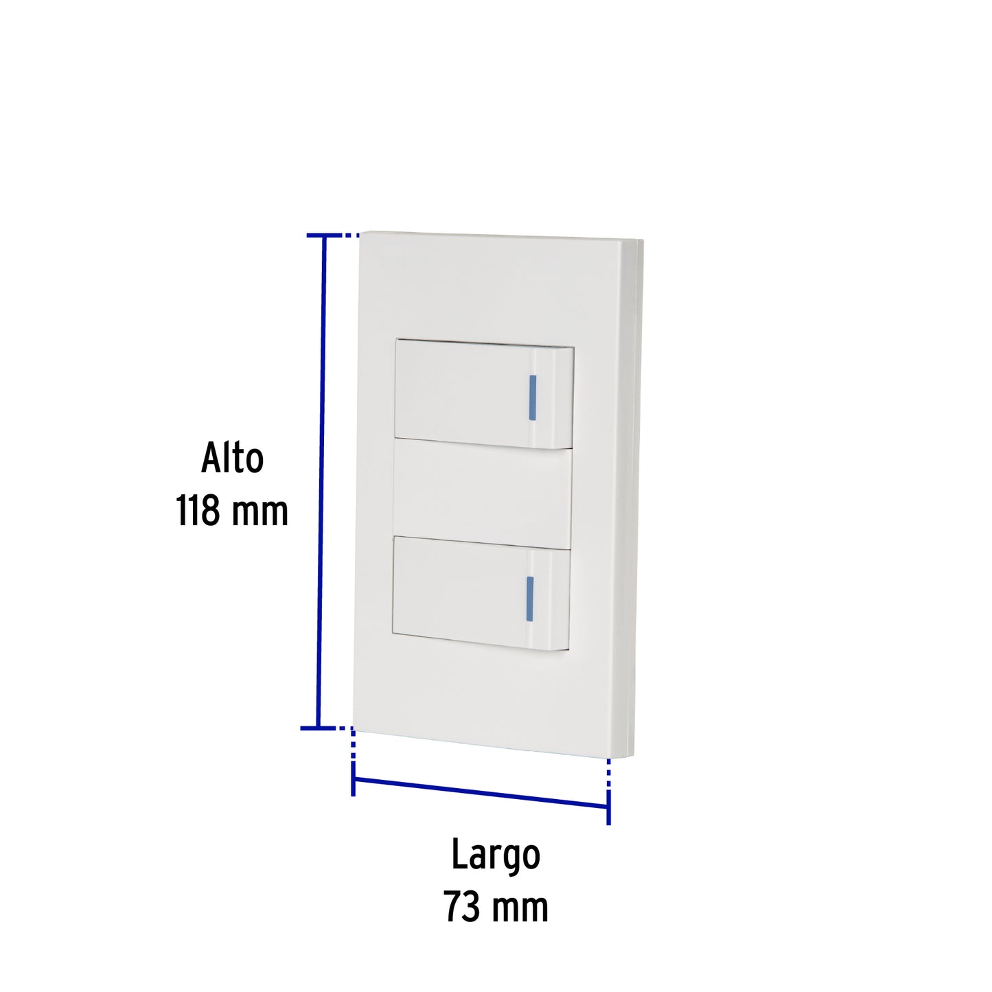 Su diseño de 1 módulo (generalmente para dos mecanismos de interruptor individuales, uno de ellos de 3 vías, verificar en truper.com) optimiza el espacio y proporciona una solución eficiente para el control de múltiples luminarias y circuitos. La línea "Española" se caracteriza por su estética moderna y bordes suaves, ideal para hogares y oficinas contemporáneos. Su instalación es sencilla y se fija a cajas de chalupa estándar. La calidad y el respaldo de VOLTECK, marca líder en productos eléctricos, aseguran su rendimiento y seguridad, garantizando un funcionamiento fiable y duradero.